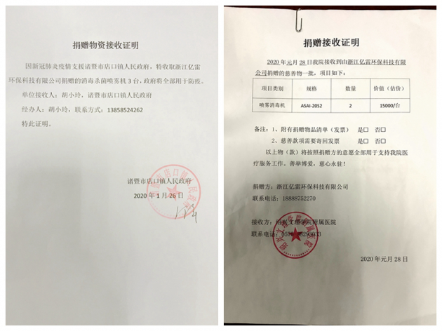 为打赢疫情防控阻击战,助力绍兴疫情防控工作,有效帮助一线工作人员抗击疫情,1月27日、28日,亿雷环保科技分别向诸暨市第四人民医院和绍兴文理学院附属医院捐赠了由亿雷自主研发的喷雾消毒机。
